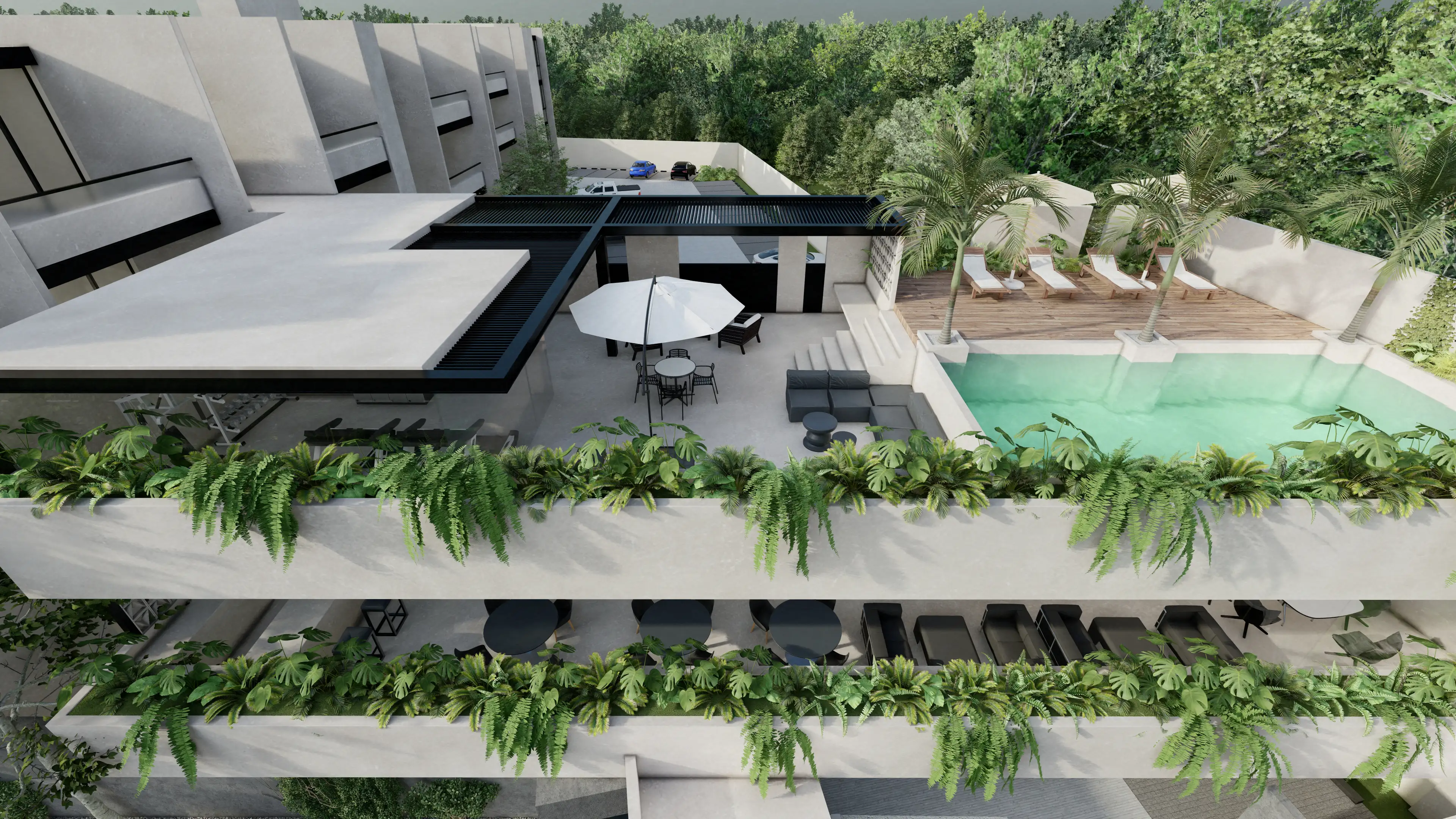 Rooftop con alberca y camastros
